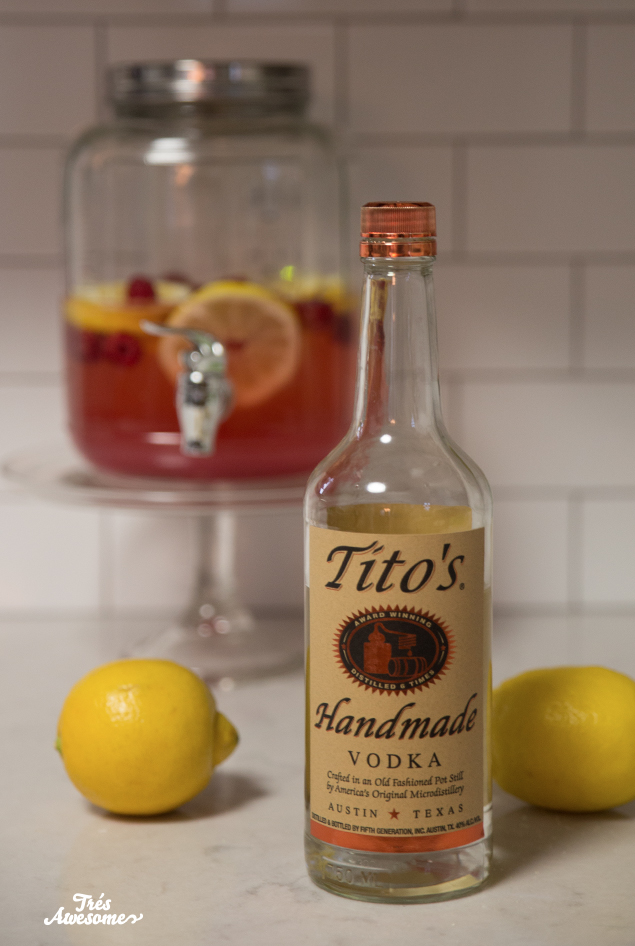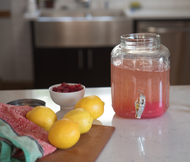 Now it's time to mix up the lemonade. I cut up the lemons and put the raspberries in the container for a pretty garnish, it's also great to let your guests get their own refills :)